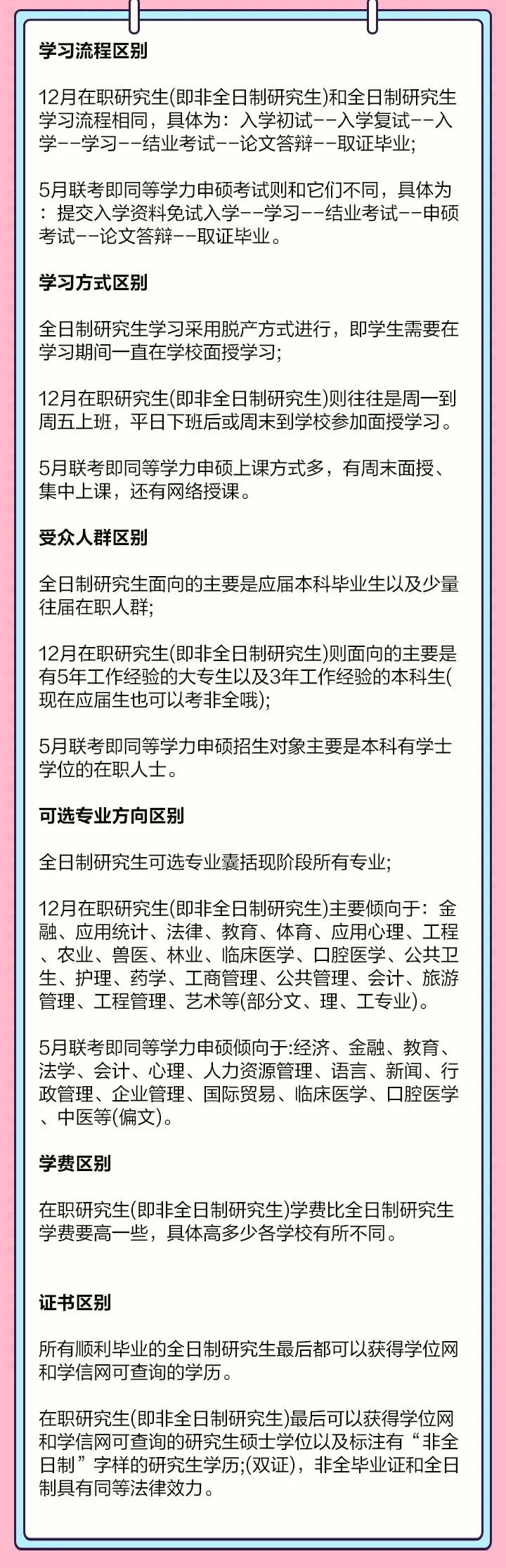 大三過后一般面臨的方向有兩個:考研和工作。然而有的同學工作后會因為種種因素選擇在職考研。大學期間考研成功的同學就是常說的全日制研究生,大學畢業后可以繼續在心儀的院校深造學習。而另工作的同學重新選擇考研,就是常見的在職研究生。同樣作為研究生,這兩者有哪些不同呢?面臨選擇的同學可以參考。