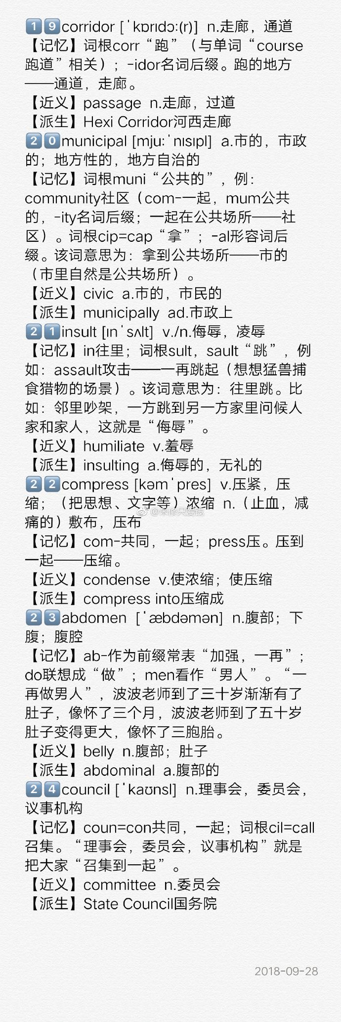 2019年全國(guó)碩士研究生招生考試初試時(shí)間為2018年12月22日至12月23日。網(wǎng)上報(bào)名時(shí)間為2018年10月10日至10月31日,預(yù)報(bào)名時(shí)間為2018年9月24日至9月27日,大家都知道考研英語(yǔ)詞匯是考研英語(yǔ)的基礎(chǔ),詞匯不扎實(shí),還想要拿高分,哼哼,天方夜譚對(duì)不對(duì)?詞匯和語(yǔ)法,是閱讀的基礎(chǔ),而且考研英語(yǔ)中閱讀占比也是蠻大的,告訴大家一個(gè)好消息,譚劍波考研英語(yǔ)將于今天定制英語(yǔ)詞匯百日沖刺全程陪伴各位備戰(zhàn)初試,今天陜西文都考研總部小編給大家整理了關(guān)于波波每日一講:譚劍波考研英語(yǔ)百日沖刺全程陪伴第二十八天的知識(shí)點(diǎn),如有需要及時(shí)加入陜西文都19考研交流群。