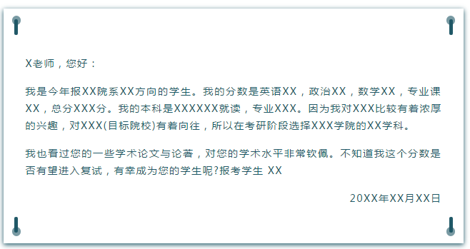 信中要介紹自己報考的專業(yè)方向,自己的分數(shù),以及自己本科學的什么專業(yè),本碩是否一致,以及對報考院系級導師的向往等等。