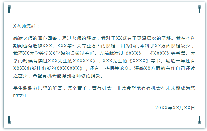 也可以繼續(xù)寫,或者等老師回信后,介紹下自己本科時學習過的和專業(yè)相關的課程,以及對專業(yè)學習做過哪些準備,自己看過哪些關于報考專業(yè)方面的書和專著,同時表示自己這方面書看的太少,有待提高,同時對老師的回復表示感謝。