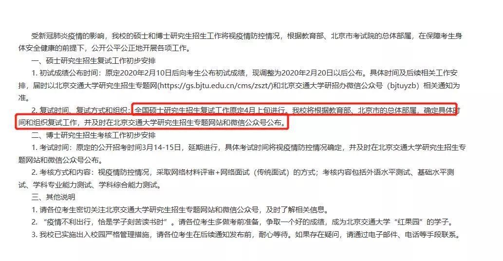 ①北京交通大學研究生招生復試工作不推遲,仍然按照原定的4月上旬進行;