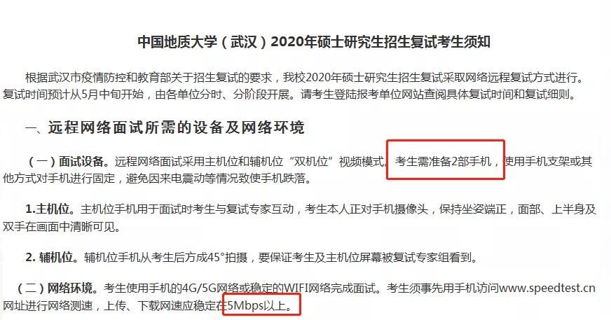 還有一些高校,比如中國地質大學(武漢)、武漢理工大學,要求雙機位都必須使用手機,并且規定了上傳、下載網速應穩定在5Mbps以上。同學們一定要注意院校的具體復試要求。