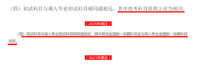 變化2:將2020年規定中的“統考科目原則上應當相同”變為“初試全國統一命題科目應與調入專業全國統一命題科目相同”。