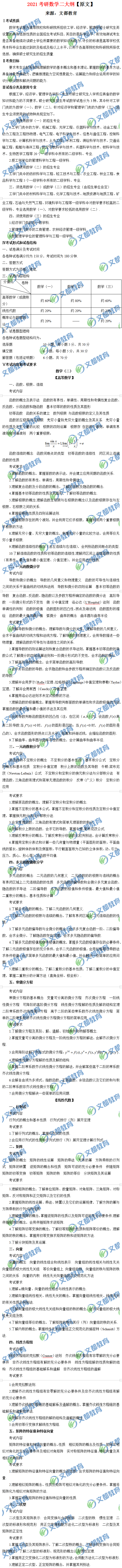 2021考研數學二大綱已發布,2021考研數學大綱在題型結構和分值比例方面有較大變化,下面隨文都考研小編一起來看下考研數學二大綱原文吧。