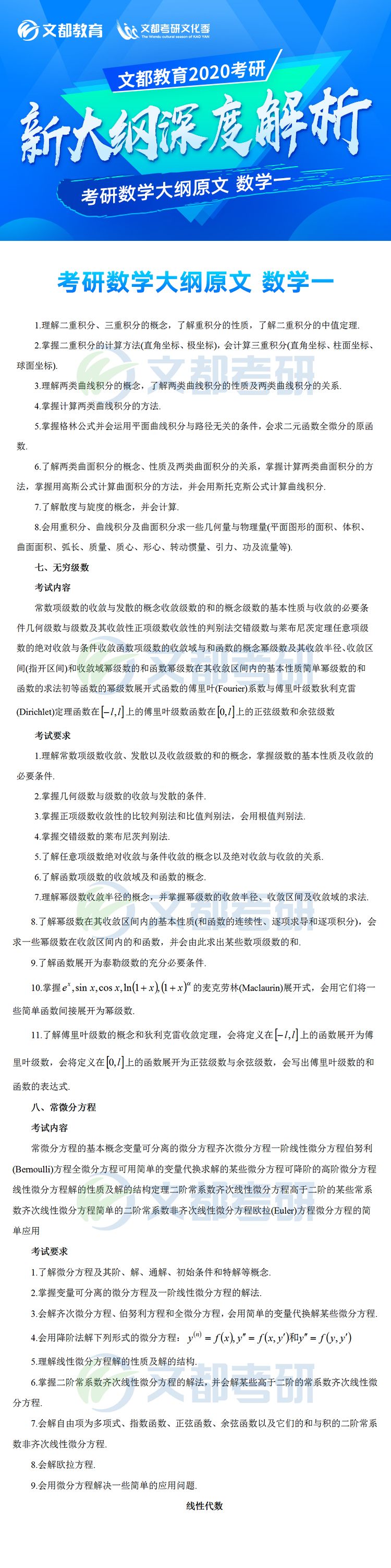 2020年全國(guó)碩士研究生招生考試各科目考研大綱已于7月8日發(fā)布,對(duì)于考生來說這是非常好的消息,有充足的時(shí)間根據(jù)新的大綱知識(shí)點(diǎn)進(jìn)行專業(yè)課復(fù)習(xí),考研數(shù)學(xué)大綱對(duì)參加研究生考試的考生考研數(shù)學(xué)復(fù)習(xí)具有指導(dǎo)意義,它可以有效矯正考生復(fù)習(xí)方向偏差的問題,讓復(fù)習(xí)方向化零為整,提高效率。。如果你還不清楚,不妨看看2020年全國(guó)碩士研究生招生考試數(shù)學(xué)考試大綱(數(shù)學(xué)一)的文章,如有需要及時(shí)加入陜西文都20考研交流群, 陜西文都考研網(wǎng)持續(xù)為您提供考研所需的相關(guān)指導(dǎo)信息。20考研資料共享:【互動(dòng)可加群】丨官方網(wǎng)站【@陜西文都考研】