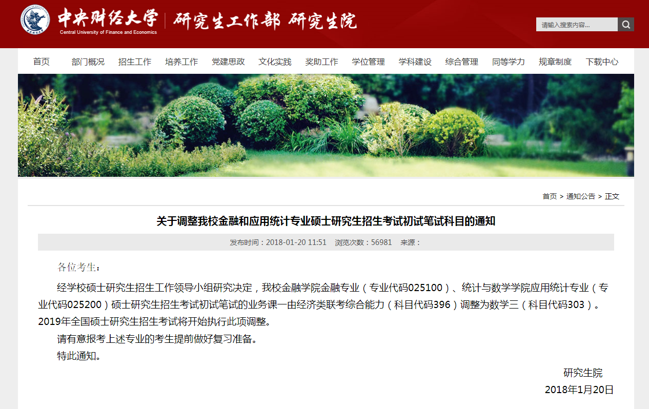 中央財經大學金融學院金融專業(專業代碼025100)、統計與數學學院應用統計專業(專業代碼025200)碩士研究生招生考試初試筆試的業務課一由經濟類聯考綜合能力(科目代碼396)調整為數學三(科目代碼303)。