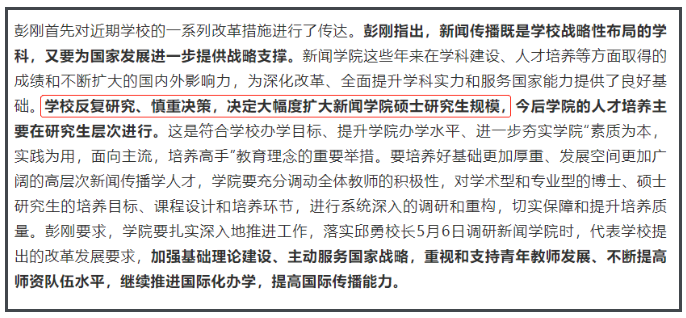 根據(jù)清華大學(xué)官方公眾號消息,副校長彭剛參加全體教職工會議時指出,決定大幅度擴(kuò)大新聞學(xué)院碩士研究生規(guī)模,今后學(xué)院的人才培養(yǎng)主要在研究生層次進(jìn)行。