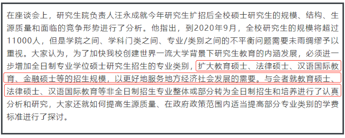 相關(guān)信息提到2020年9月,全校研究生規(guī)模將超過11000人,但是存在學(xué)院之間、學(xué)科門類之間、專業(yè)/類別之間的不平衡問題,并表示必須進(jìn)一步增加全日制專碩的招生類別,擴(kuò)大教育碩士、法律碩士、漢語國際教育、金融碩士等的招生規(guī)模。