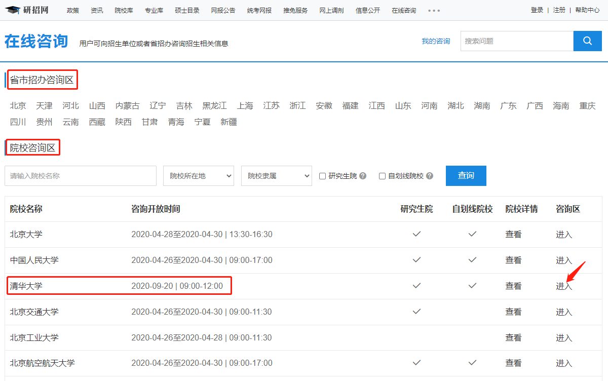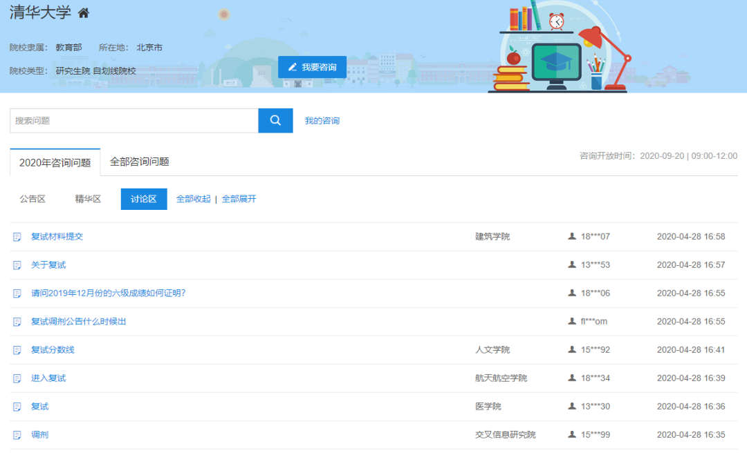 打開之后,從下圖可以看到,目前只有清華大學更新咨詢時間,但只在9月20日當天上午9點到中午12點,短短3個小時。報考清華大學的同學,如果有問題,一定要在這三小時之內提問??!