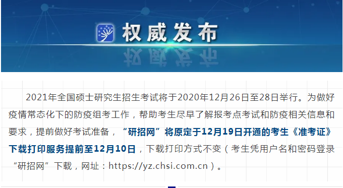 2021年全國碩士研究生招生考試將于2020年12月26日至28日舉行。為做好疫情常態(tài)化下的防疫組考工作,幫助考生盡早了解報考點考試和防疫相關信息和要求,提前做好考試準備,“研招網”將原定于12月19日開通的考生《準考證》下載打印服務提前至12月10日,下載打印方式不變(考生憑用戶名和密碼登錄“研招網”下載,網址:https://yz.chsi.com.cn)。