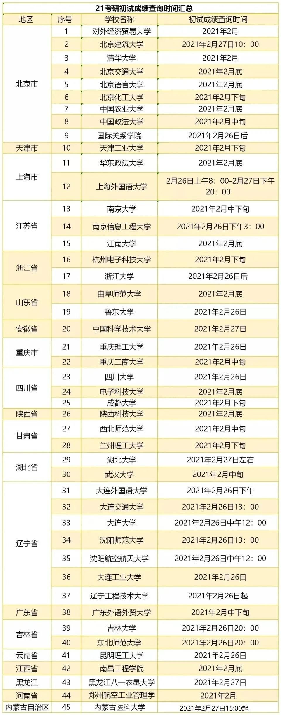 如果上面45所公布查成績時間的高校沒有你報名的,伙伴們可以參考省市公布的出分時間。各省市2021考研最新出分時間也給伙伴們統計好了: