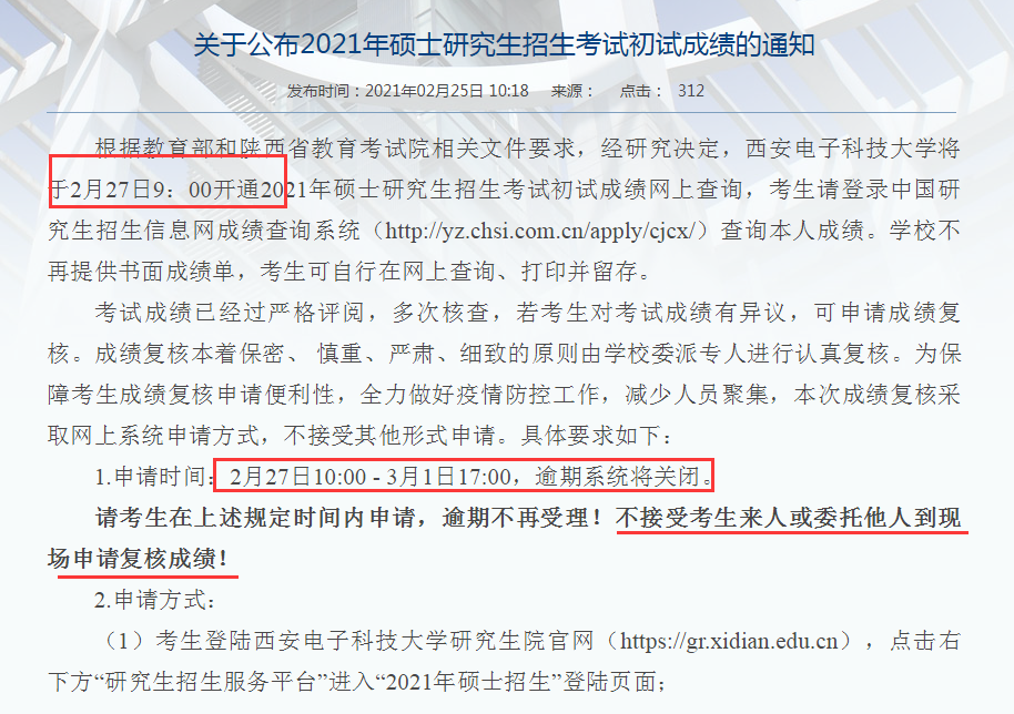 根據教育部和陜西省教育考試院相關文件要求,經研究決定,西安電子科技大學將于2月27日9:00開通2021年碩士研究生招生考試初試成績網上查詢,考生請登錄中國研究生招生信息網成績查詢系統(http://yz.chsi.com.cn/apply/cjcx/)查詢本人成績。學校不再提供書面成績單,考生可自行在網上查詢、打印并留存。
