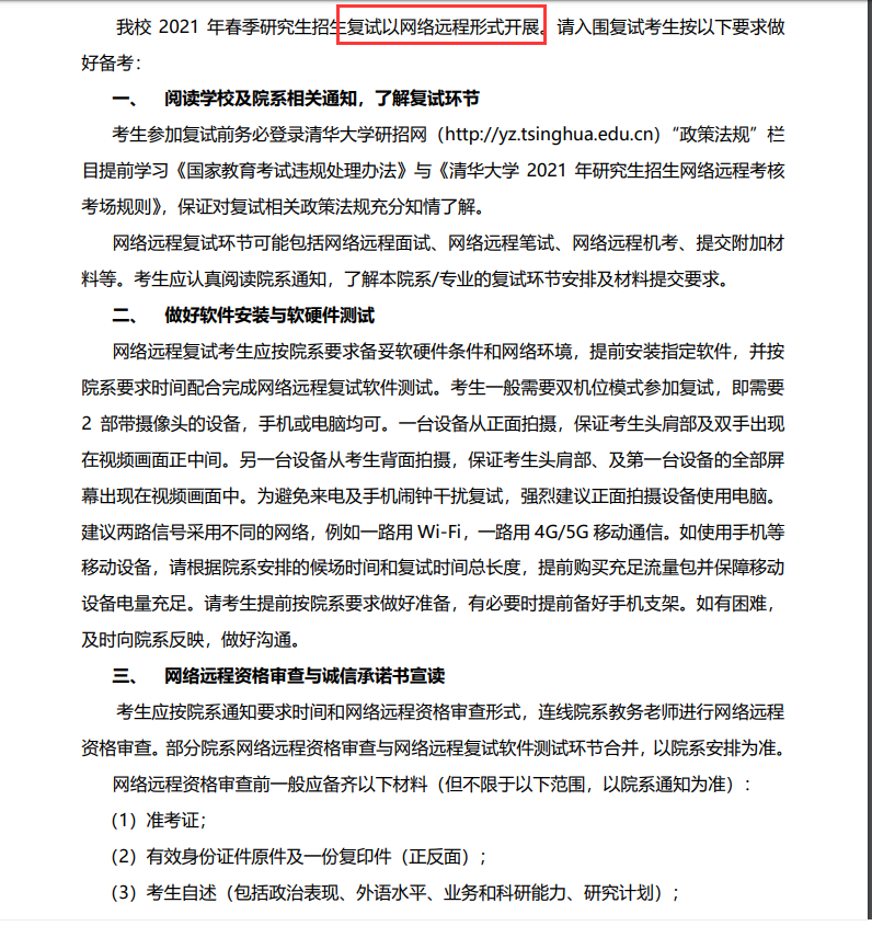 清華大學(xué)2021年碩士研究生招生考試以網(wǎng)絡(luò)遠程復(fù)試為主