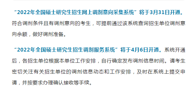 “2022年全國碩士研究生招生網上調劑意向采集系統”將于3月31日開通。符合調劑條件且有調劑意向的考生,可提前通過該系統查詢招生單位調劑意向余額,做好調劑準備。