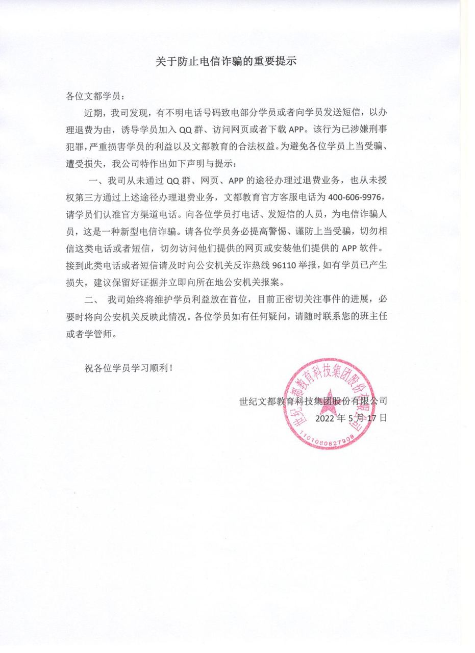 近期,我司發(fā)現(xiàn),有不明電話號(hào)碼致電部分學(xué)員或者向?qū)W員發(fā)送短信,以辦理退費(fèi)為由,誘導(dǎo)學(xué)員加入QQ群、訪問網(wǎng)頁(yè)或者下載APP。該行為已涉嫌刑事犯罪,嚴(yán)重?fù)p害學(xué)員的利益以及文都教育的合法權(quán)益。為避免各位學(xué)員上當(dāng)受騙、遭受損失,我公司特作出如下聲明與提示: