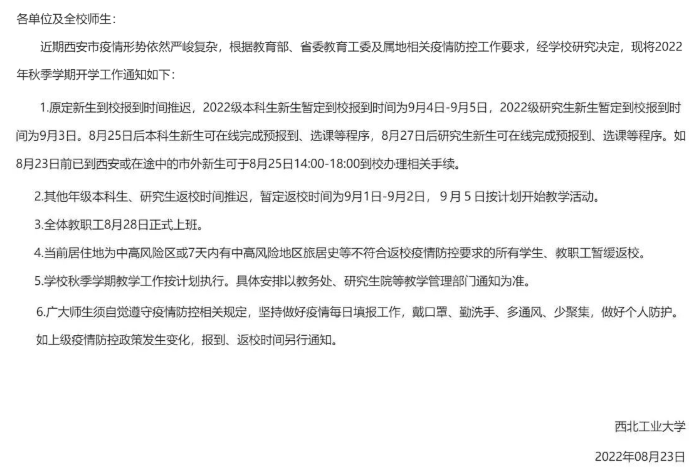 西北工業(yè)大學(xué)關(guān)于做好2022年秋季學(xué)期開學(xué)工作的通知