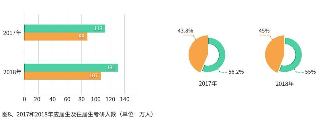 據教育部統計,2017年共201萬人報考,其中,應屆考生113萬人,往屆考生88萬人;2018年共238萬人報考,其中,應屆考生131萬人,往屆考生107萬人。從數據可知,2017年,往屆生考研人數占全國報考人數的43.8%,2018年,往屆生考研人數占全國報考人數的45%,同比上升了1.2%。