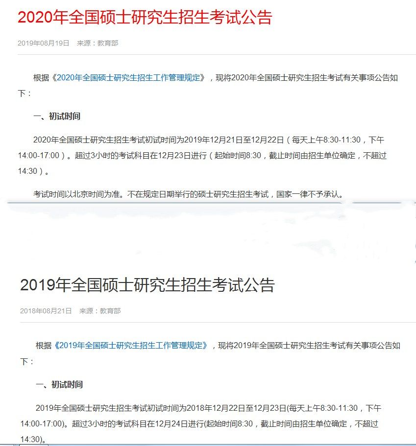 2020年全國碩士研究生招生考試初試時間為2019年12月21日至12月22日(每天上午8:30-11:30,下午14:00-17:00)。超過3小時的考試科目在12月23日進行(起始時間8:30,截止時間由招生單位確定,不超過14:30)。