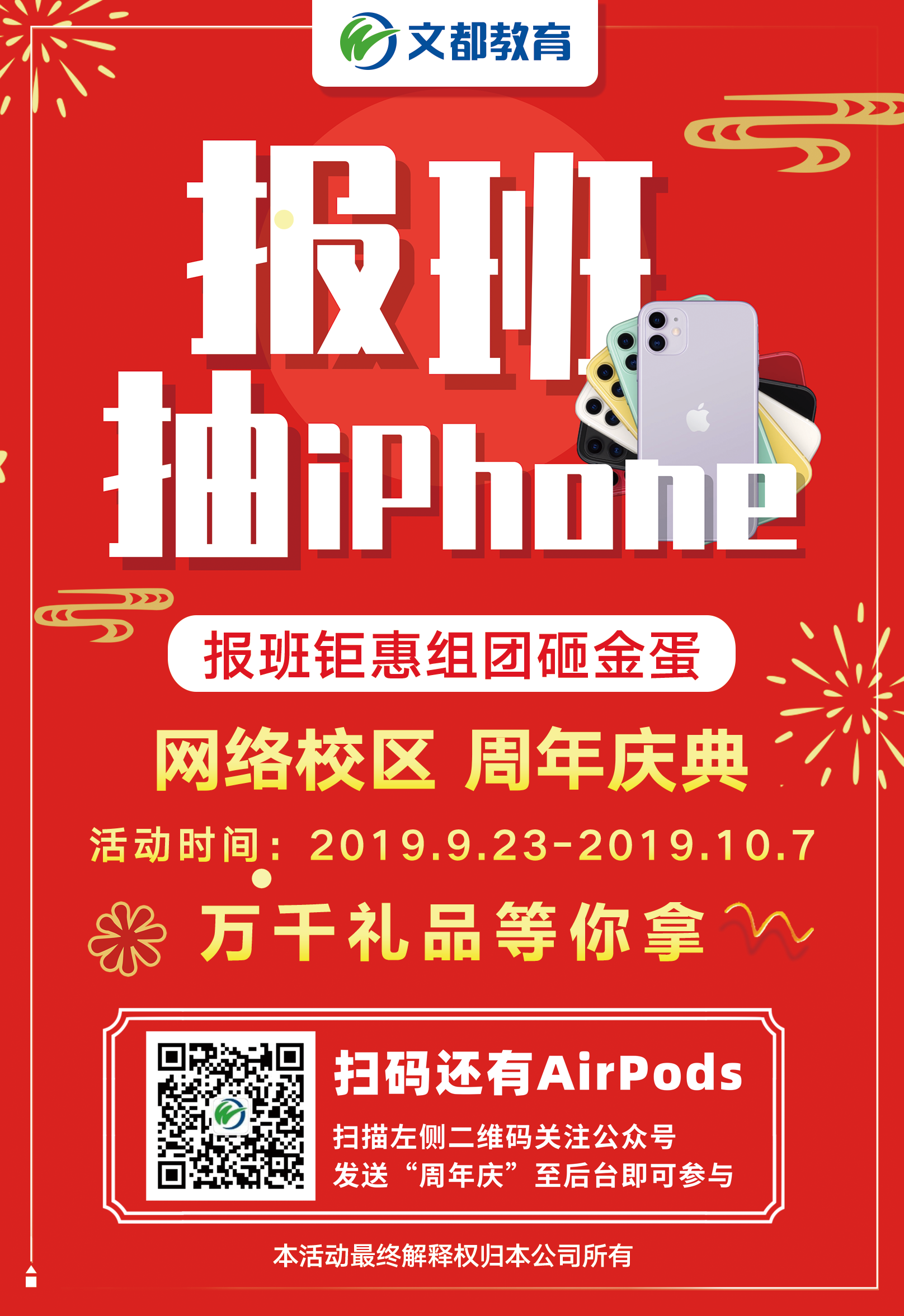 時間過得真快,迎來了陜西文都考研網(wǎng)絡校區(qū)的周年慶。借此周年慶的機會,我們舉辦一場“網(wǎng)絡校區(qū)周年慶,報班抽取iphone11”的活動。這次活動不僅時間長,活動力度大,獎品豐富,最大的驚喜要莫過于我們的特等獎,居然是今年蘋果新推出的“iphone11”。小編當時看到這個獎品,產(chǎn)生了報班的沖動,你是不是也有這種感覺呢?來吧!和小編一起來看看具體活動吧!