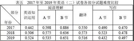 從以上表格可以看出,2017年-2019年英語二的試卷中,閱讀理解部分和寫作部分難度整體穩定,翻譯部分難度較前兩年略微提高,但是,A節要稍難于往年,B節比往年稍易。