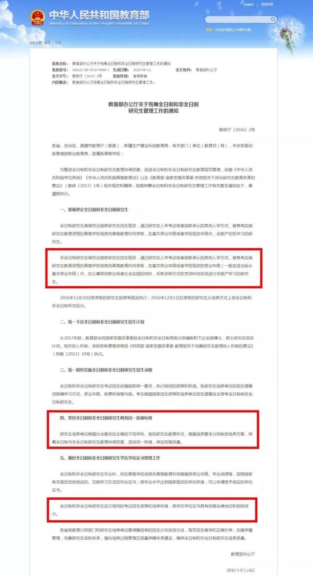 2016年9月14日教育部辦公廳發(fā)布了《教育部辦公廳關(guān)于統(tǒng)籌全日制和非全日制研究生管理工作的通知》,文件明確指出“堅(jiān)持全日制和非全日制研究生教育同一質(zhì)量標(biāo)準(zhǔn)。”