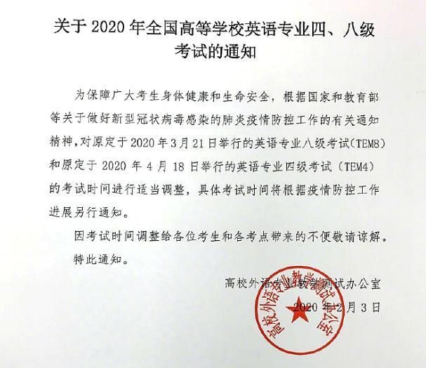 高校外語專業教學測試辦公室發布通知,對原定于2020年3月21日舉行的英語專業八級考試(TEM8)和原定于2020年4月18日舉行的英語專業四級考試(TEM4)的考試時間進行適當調整,具體考試時間另行通知。