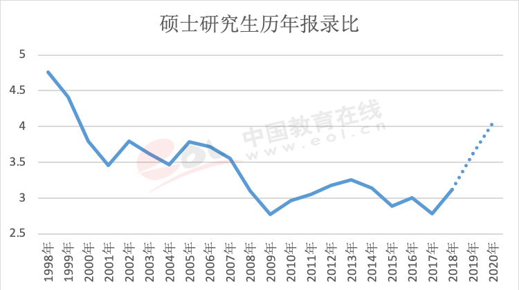 近幾年雖然研究生招生數量不斷增長,但增幅低于報名人數增長幅度,研究生報錄比不斷提升。