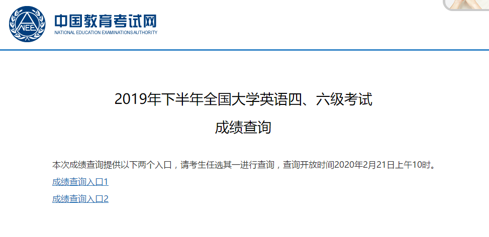 2019年12月英語四六級成績查詢時間為2020年2月21日10時,下面是查分入口詳情: