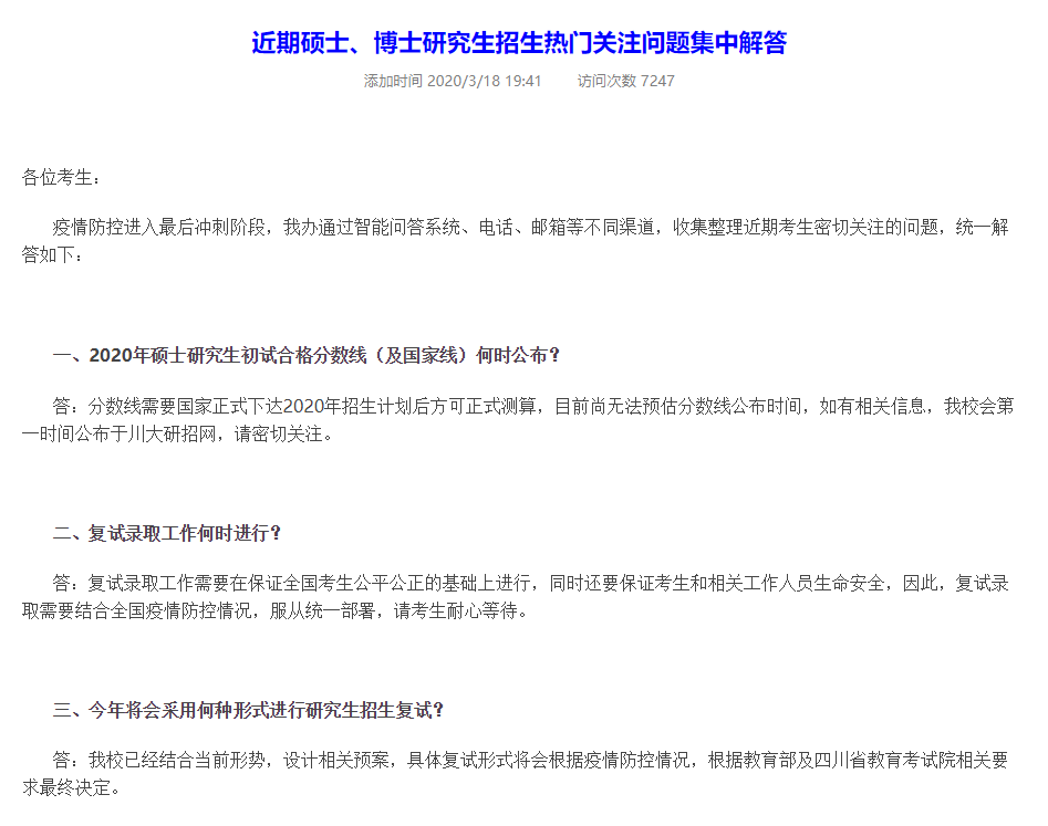 3月18日,四川大學研究生招生信息網發布了一個公告:《近期碩士、博士研究生招生熱門關注問題集中解答》