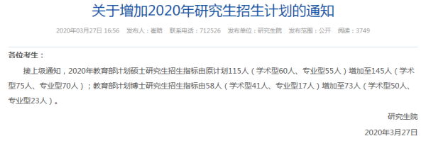 接上級通知,2020年教育部計劃碩士研究生招生指標由原計劃115人(學術型60人、專業(yè)型55人)增加至145人(學術型75人、專業(yè)型70人);教育部計劃博士研究生招生指標由58人(學術型41人、專業(yè)型17人)增加至73人(學術型50人、專業(yè)型23人)。