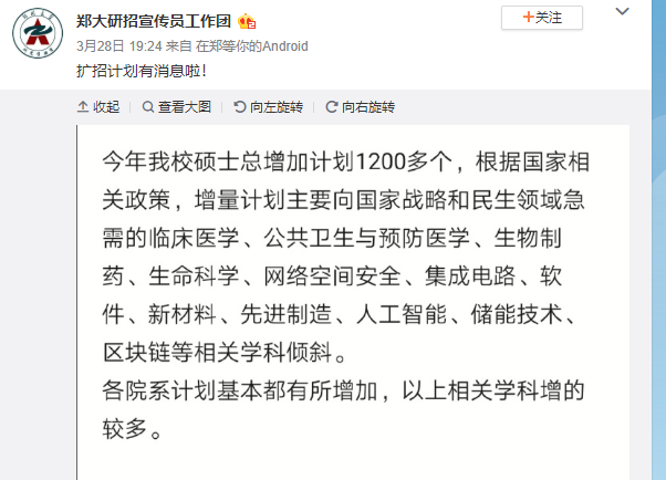3月28日晚,鄭大研招宣傳員工作團(鄭州大學研招辦方微博)稱今年碩士總增加計劃1200多個,根據國家相關政策,增量計劃主要向國家戰略和民生領域急需的臨床醫學、公共衛生與預防醫學、生物制藥、生命科學、網絡空間安全、集成電路、軟件、新材料、先進制造、人工智能、儲能技術、區塊鏈等相關學科傾斜。