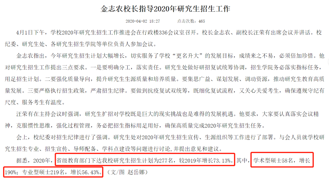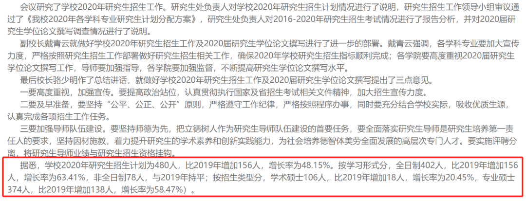 2020年研究生招生計劃為480人,比2019年增加156人,增長率為48.15%。其中,全日制402人,比2019年增加156人,增長率為63.41%,非全日制78人,與2019年持平;學術碩士106人,比2019年增加18人,增長率為20.45%,專業碩士374人,比2019年增加138人,增長率為58.47%。