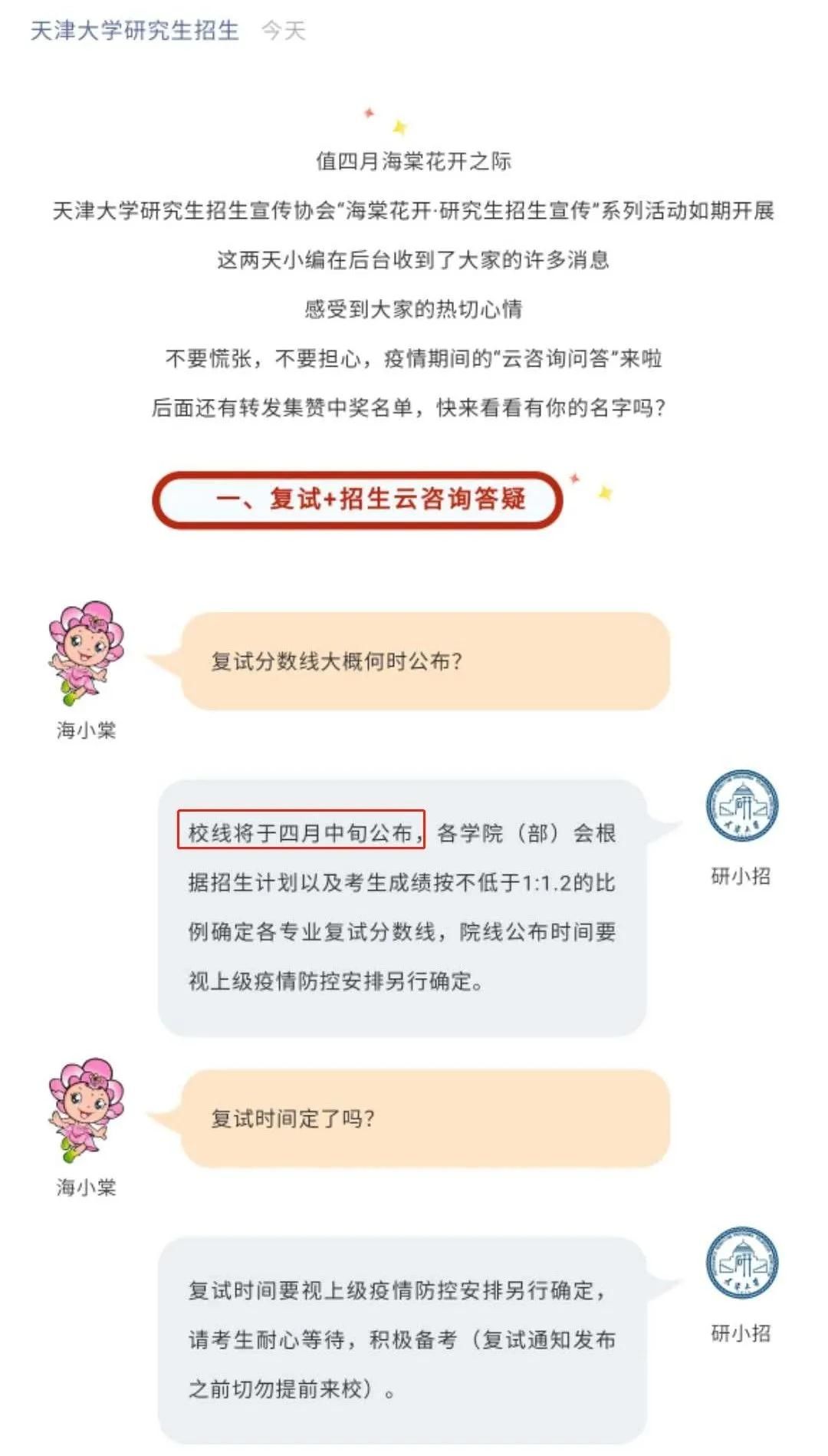 繼中科大、人大、西交通知或者明示2020考研復試線發(fā)布時間后,又有一所自劃線高校有了相關動態(tài)。近日,天津大學研究生招生公眾號發(fā)布消息稱:校線將于四月中旬公布,各學院(部)會根據(jù)招生計劃以及考生成績按不低于1:1.2的比例確定各專業(yè)復試分數(shù)線,院線公布時間要視上級疫情防控安排另行確定。復試時間、復試形式要視上級疫情防控安排另行確定,請考生耐心等待,積極備考(復試通知發(fā)布之前切勿提前來校)。
