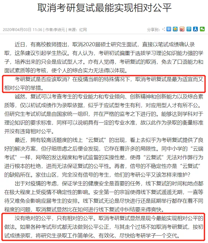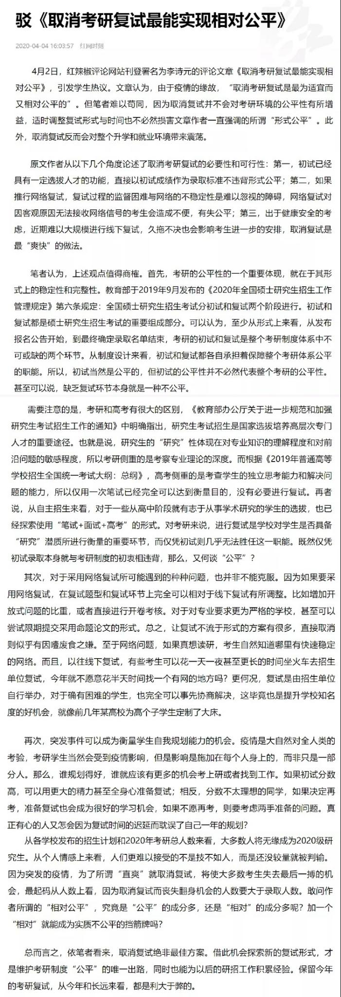 4號下午四點多紅網再次發文《駁<取消考研復試最能實現相對公平>》