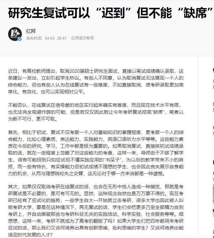 3號晚8點多,紅網再發文:取消考研復試確實有短期之效,可以更快地完成考研招生工作,但會降低導師學生的匹配度,因此筆者以為,考研復試可以“遲到”但不能“缺席”。