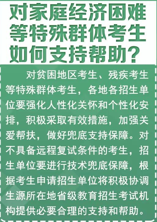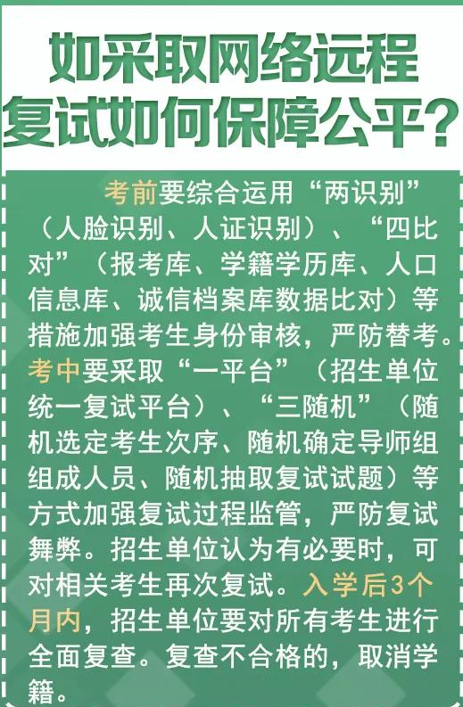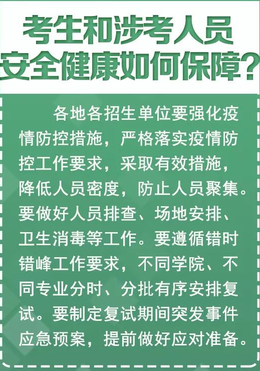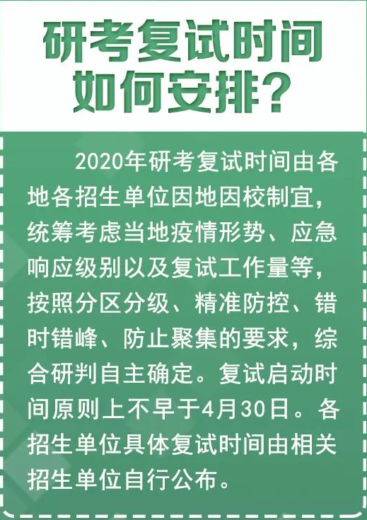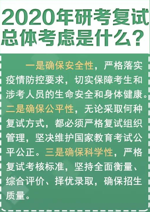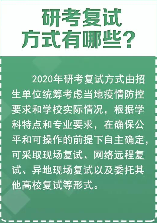 各招生單位要在省級高校招生委員會的統一領導下,統籌考慮當地疫情防控要求和學校實際情況,因地因校制宜,自主確定復試辦法。復試時間由各招生單位統籌考慮當地疫情形勢、應急響應級別以及復試工作量等,按照分區分級、精準防控、錯時錯峰、防止聚集的要求,綜合研判自主確定。復試啟動時間原則上不早于4月30日。復試方式由各招生單位根據學科特點和專業要求,在確保公平和可操作的前提下自主確定,可采取現場復試、網絡遠程復試、異地現場復試以及委托其他高校復試等。各招生單位要結合本地本單位情況,對擬采取的復試方式進行充分評估,確保復試安排的安全性、公平性和科學性。采取現場復試的,要提前制定復試工作流程、防控措施和應急預案,盡量減少不必要的環節,防止人員聚集。同時,落實好各項防護措施,做好突發情況下的應急處置準備。采取遠程復試的,要對軟件平臺的適用性、安全性、可靠性和穩定性等功能進行充分評估,確保滿足遠程復試要求。招生單位復試辦法須報省級教育行政部門疫情防控工作領導小組審核同意后向社會公布并組織實施。