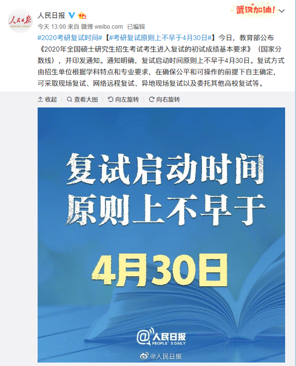 復(fù)試時(shí)間原則上不早于4月30日復(fù)試方式由招生單位自主確定