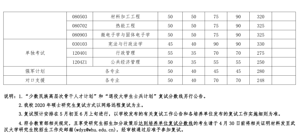 4.符合教育部相關(guān)規(guī)定,且享受研究生招生加分政策后達(dá)到培養(yǎng)單位復(fù)試分?jǐn)?shù)線的考生請(qǐng)于4月30日前將相關(guān)證明材料發(fā)至武漢大學(xué)研究生院招生工作處郵箱(wdyz@whu.edu.cn),經(jīng)審核通過(guò)后準(zhǔn)予參加復(fù)試。