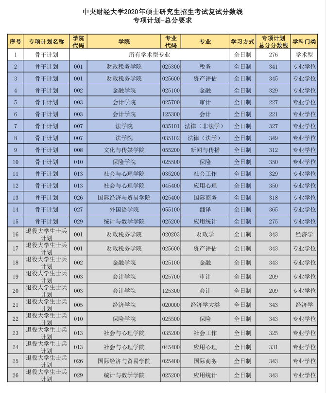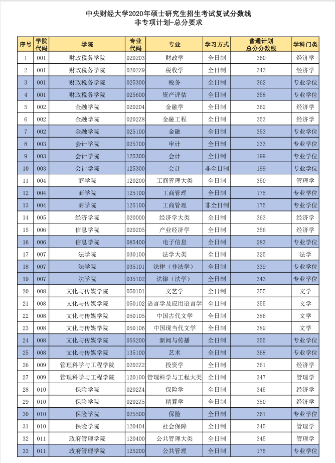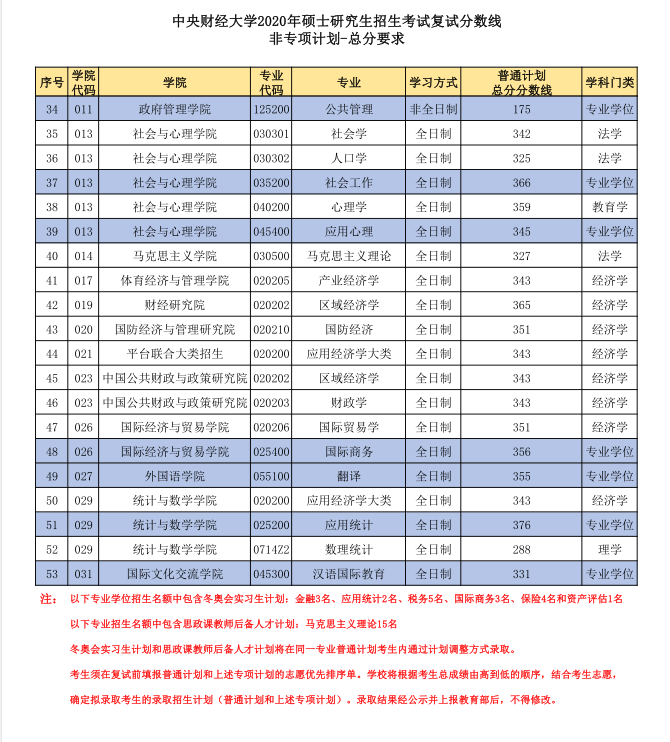 1.中央財經大學2020年碩士研究生招生考試復試總分分數線(非專項計劃和專項計劃)