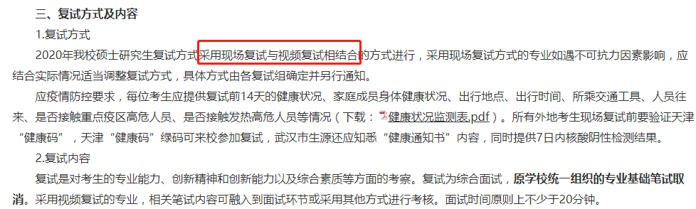 應疫情防控要求,每位考生應提供復試前14天的健康狀況、家庭成員身體健康狀況、出行地點、出行時間、所乘交通工具、人員往來、是否接觸重點疫區高危人員、是否接觸發熱高危人員等情況。所有外地考生現場復試前要驗證天津“健康碼”,天津“健康碼”綠碼可來校參加復試,武漢市生源還應知悉“健康通知書”內容,同時提供7日內核酸陰性檢測結果。