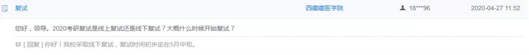 西藏藏醫學院在問答中回復今年研究生復試采取線下復試,復試時間初步定在5月中旬。