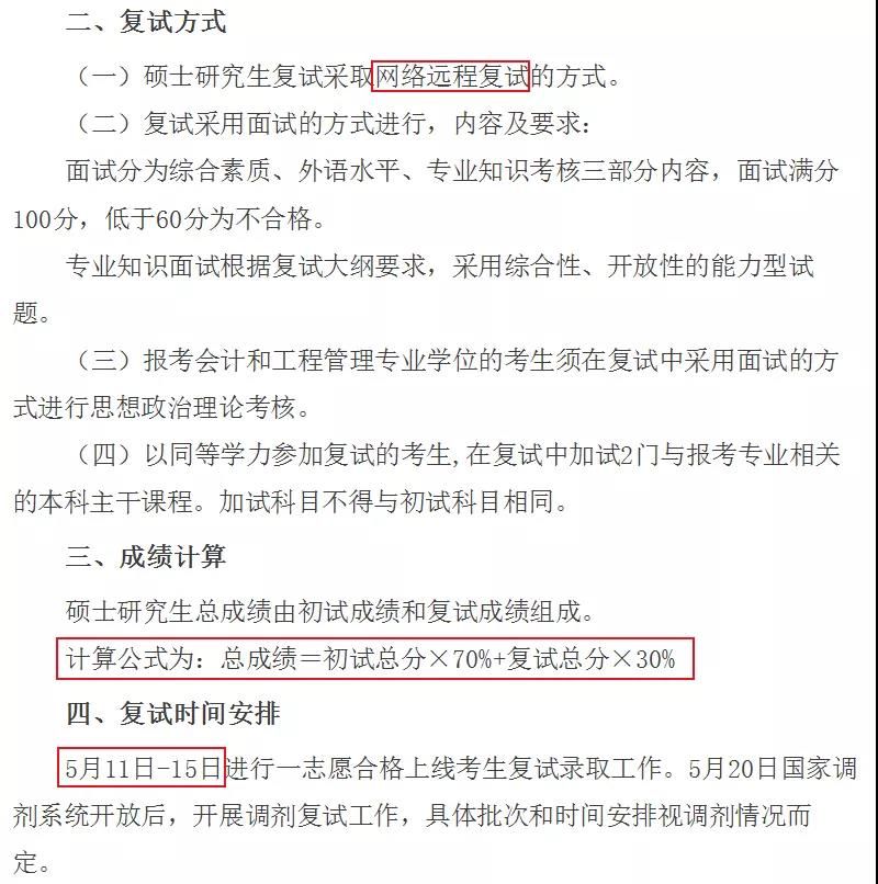 2.考生總成績?yōu)?00分,其中初試成績占70%,復試成績占30%。初試成績和復試成績相加之和,為招生考試總成績。