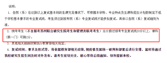 統(tǒng)考考生(不含報(bào)考蘇州聯(lián)合研究生院考生和管理類聯(lián)考考生)總分超過報(bào)考專業(yè)復(fù)試線20分以上,單科(限一門)可降2分。