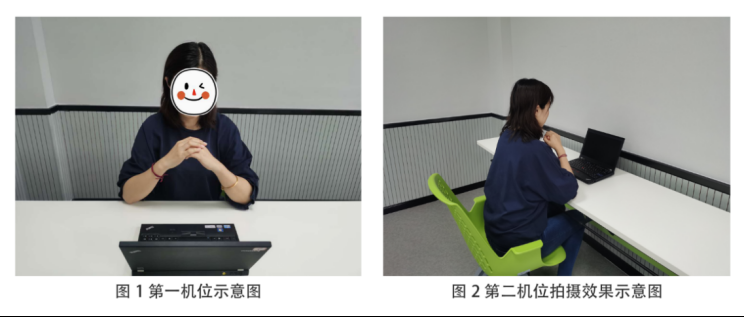 筆記本電腦(第一機位)從正面拍攝,放置在距離本人30cm左右處,手機(第二機位)從考生側后方45°距離本人30cm左右處拍攝,確保第一機位和第二機位分別從考生面前和身后完整拍攝到考生全身、面試小組能夠從第二機位清晰看到第一機位屏幕。效果圖如下: