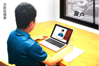 主機位為面試主機位(最好為筆記本電腦或臺式機),面向考生,用于考官對考生的遠程視頻考核。放置面試主機位的書桌應緊貼墻面擺放,主機位攝像頭覆蓋房間門口。考試開始時考生將主機位攝像頭環繞360度,使面試人員查看考場全部場景。考生本人正對設備攝像頭,保持坐姿端正,面部、上半身及雙手在畫面中清晰可見。示意圖如下: