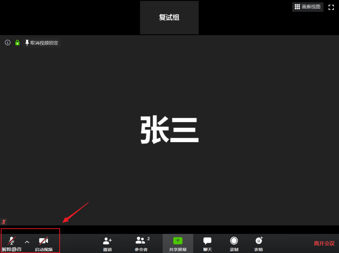2.連接成功后點擊左下角解除靜音及啟動視頻,開啟話筒及攝像頭