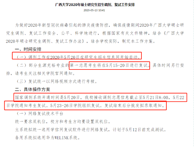 國家調劑系統開通時間是5月20日,我校接收調劑志愿信息截止至5月21日8:00,5月22日學院通知考生復試。5月23-26日學院組織復試。復試結束后分批發擬錄取通知。