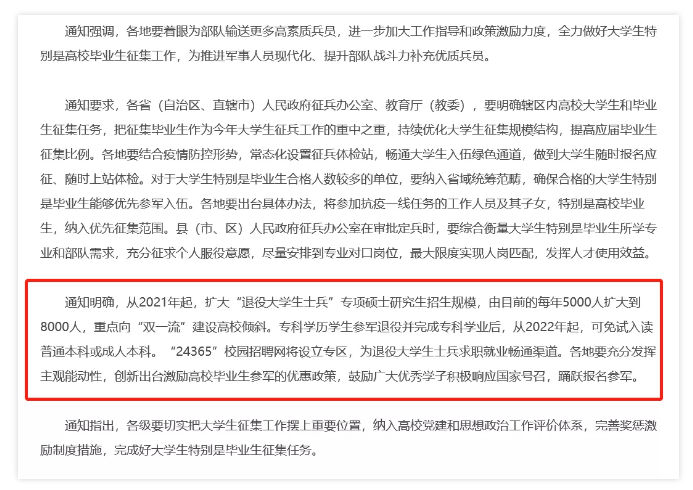 昨天,教育部印發(fā)通知部署2020年大學(xué)生征兵工作,通知中寫到從2021年起,擴(kuò)大“退役大學(xué)生士兵”專項(xiàng)碩士研究生招生規(guī)模,由目前的每年5000人擴(kuò)大到8000人,重點(diǎn)向“雙一流”建設(shè)高校傾斜。專科學(xué)歷學(xué)生參軍退役并完成專科學(xué)業(yè)后,從2022年起,可免試入讀普通本科或成人本科。