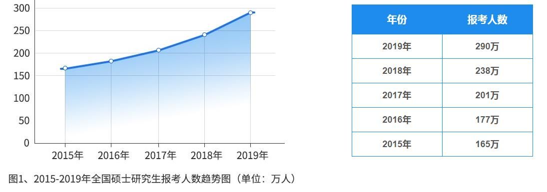 2018年12月23日,又一年的考研大戰開始,這一年的考研人數,再一次變成了“歷史新高”。從教育部公布的數據來看,2019年全國考研報名人數達到了史無前例的290萬人,比2018年考研人數增加了52萬人,增幅達到了21.8%,考研增加人數和增長率均為近年來最高。從上圖中我們可以看出,近5年,考研人數逐年增長,同2015年的165萬人相比增加了125萬人,研究生報考人數的快速上漲也引發了社會的廣泛關注。