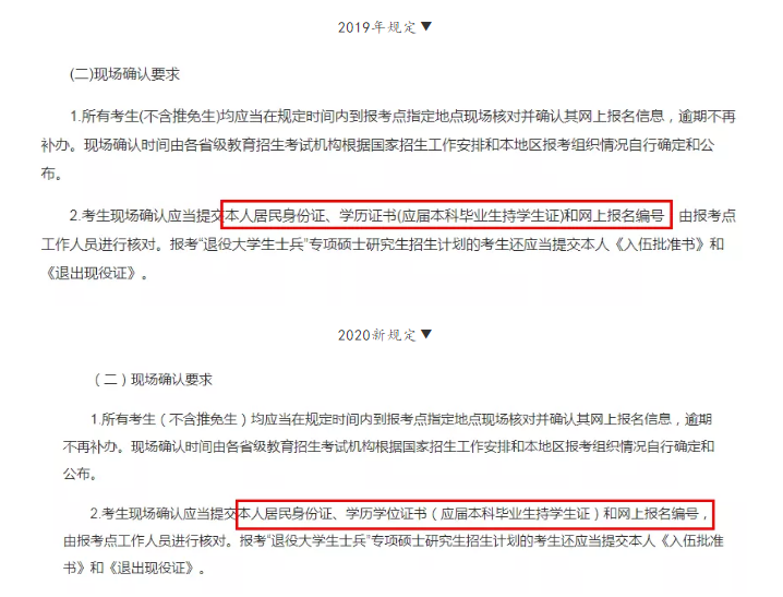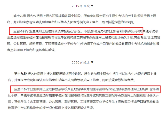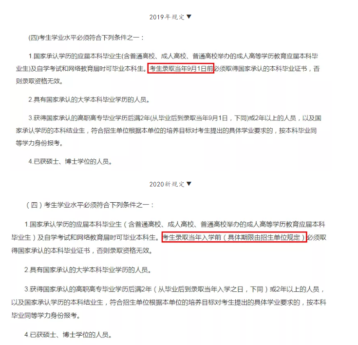 19年考研的規(guī)定是考生錄取當(dāng)年9月1日前必須取得國家承認(rèn)的本科畢業(yè)證書,20年新規(guī)定是考生錄取當(dāng)年入學(xué)前必須取得國家承認(rèn)的本科畢業(yè)證書(具體期限由招生單位規(guī)定),對(duì)考生的畢業(yè)時(shí)間要求有所寬松了,